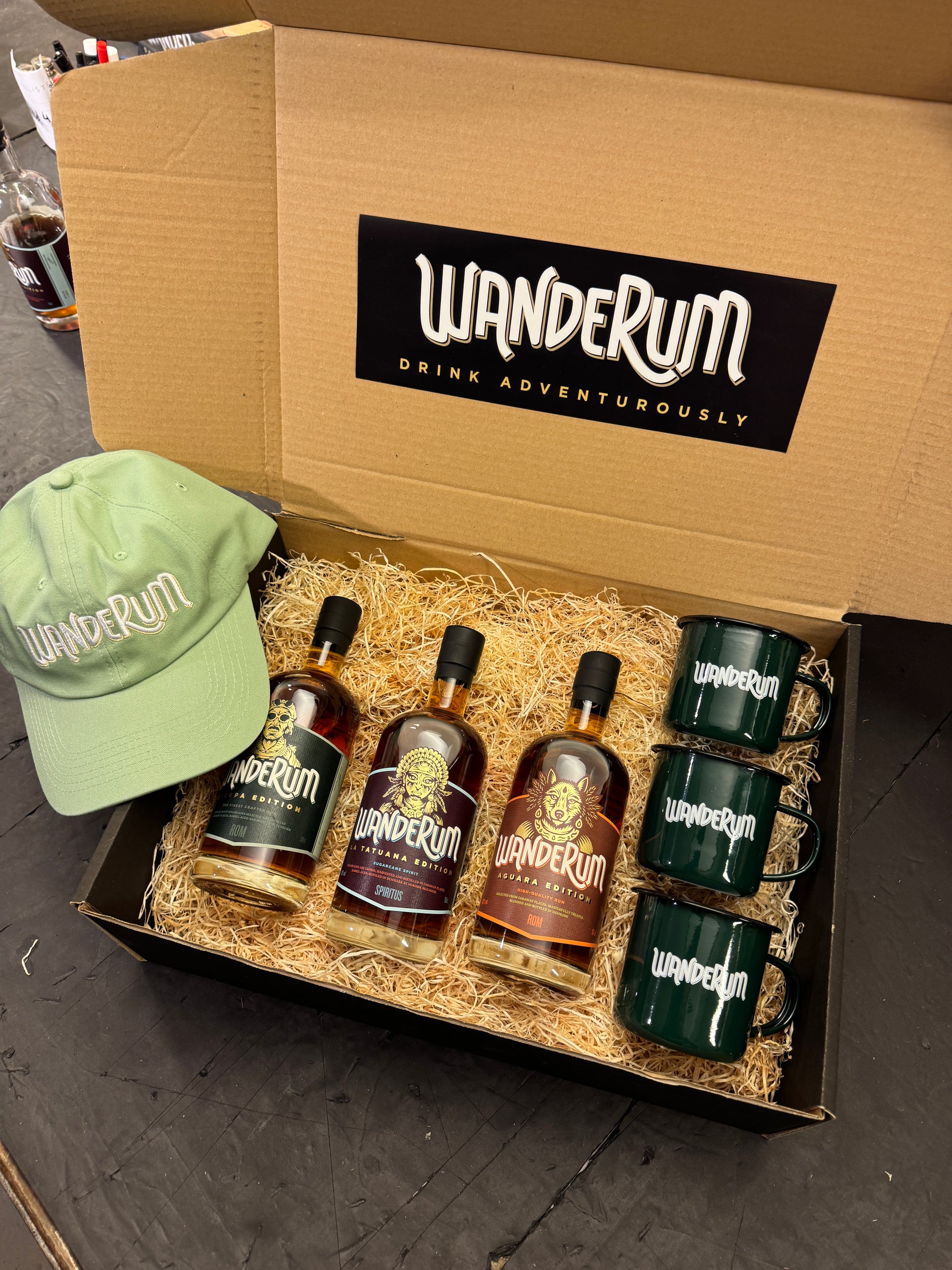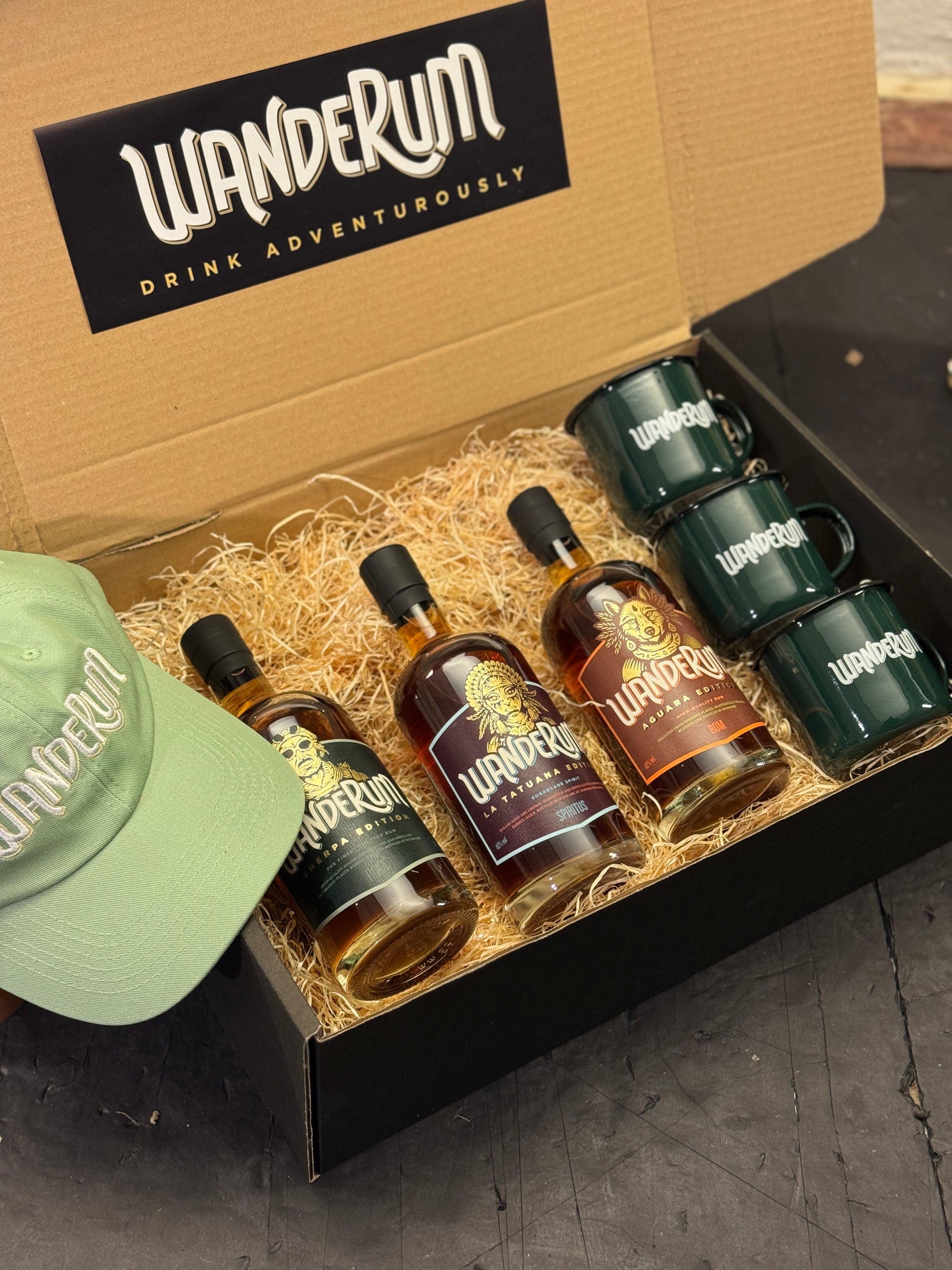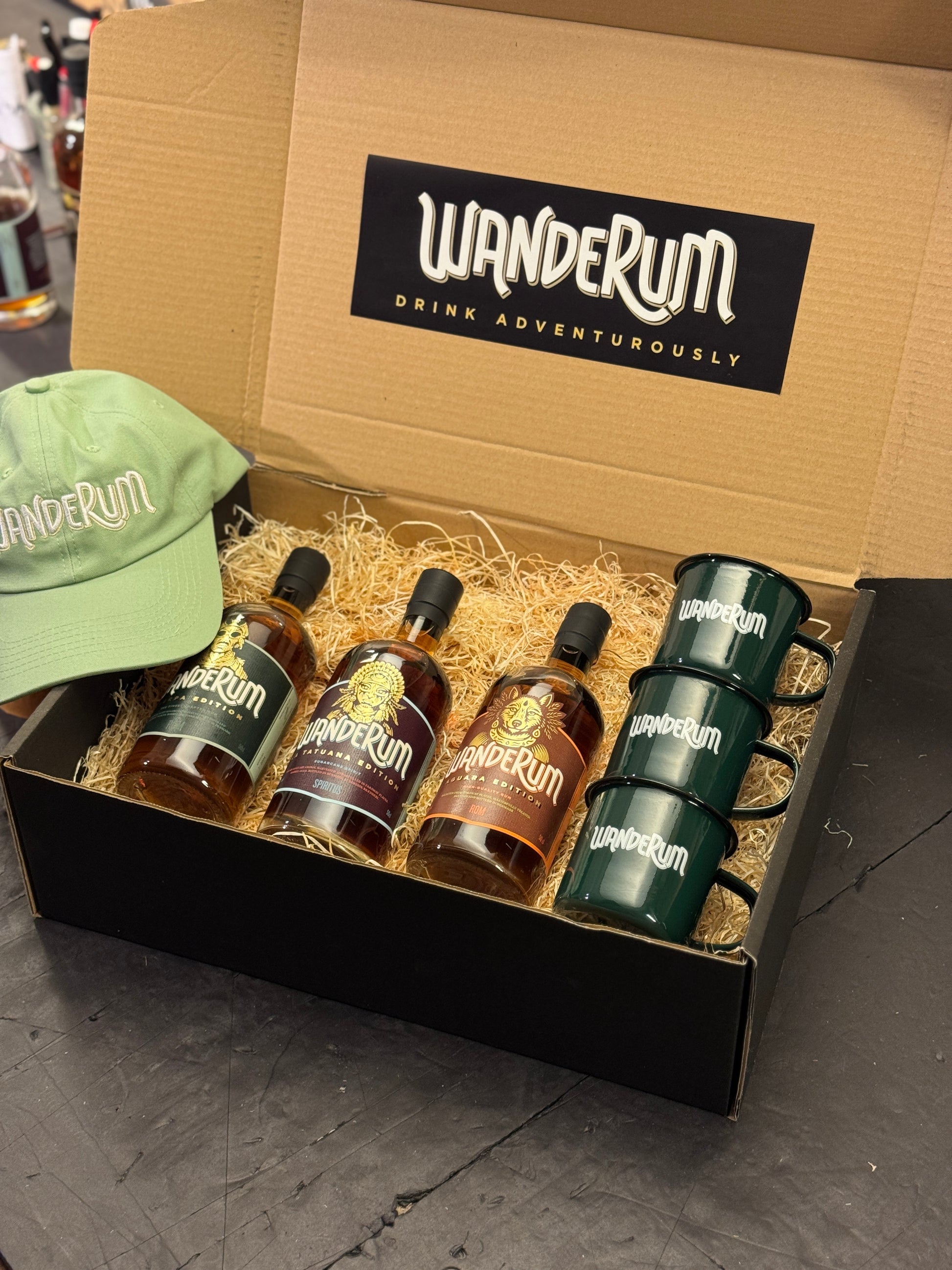 Få fat i Wanderums gaveæske med 3 flasker Wanderum i en gaveæske fyldt med alt hvad man skal bruge til et godt eventyr.